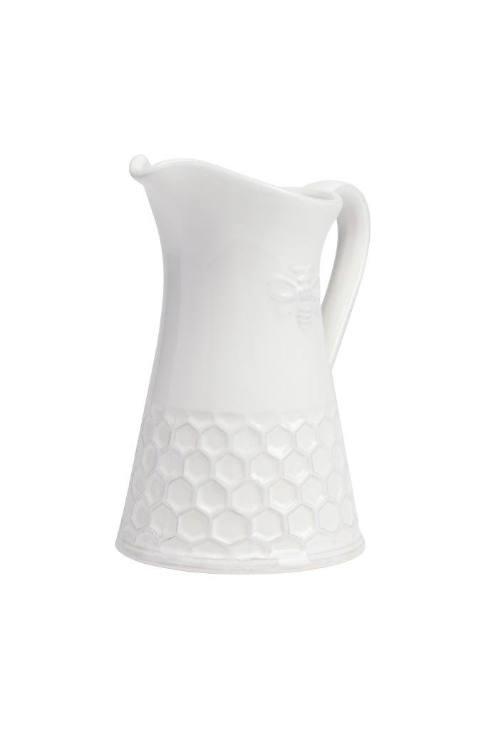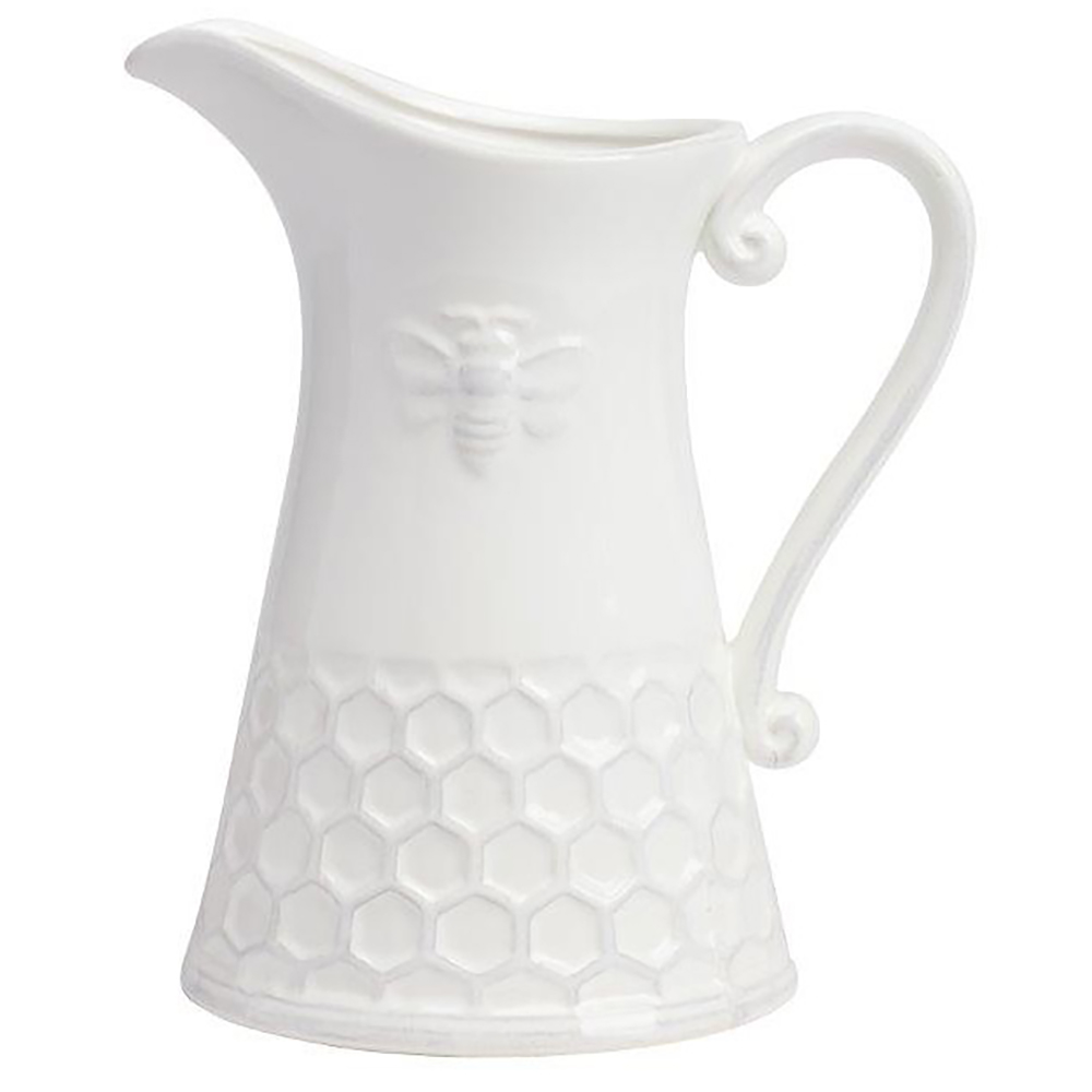 Элегантный керамический белый кувшин классической формы с декором в виде пчелы и медовых сотов, подарит вам эстетическое наслаждение и позитивный настрой. Несмотря на минимальный декор, он выглядит очень элегантно и вполне подойдет для украшения гостиной, кухни и дачного стола. Кувшин можно приобрести отдельно или в дополнение к другим предметам коллекции.