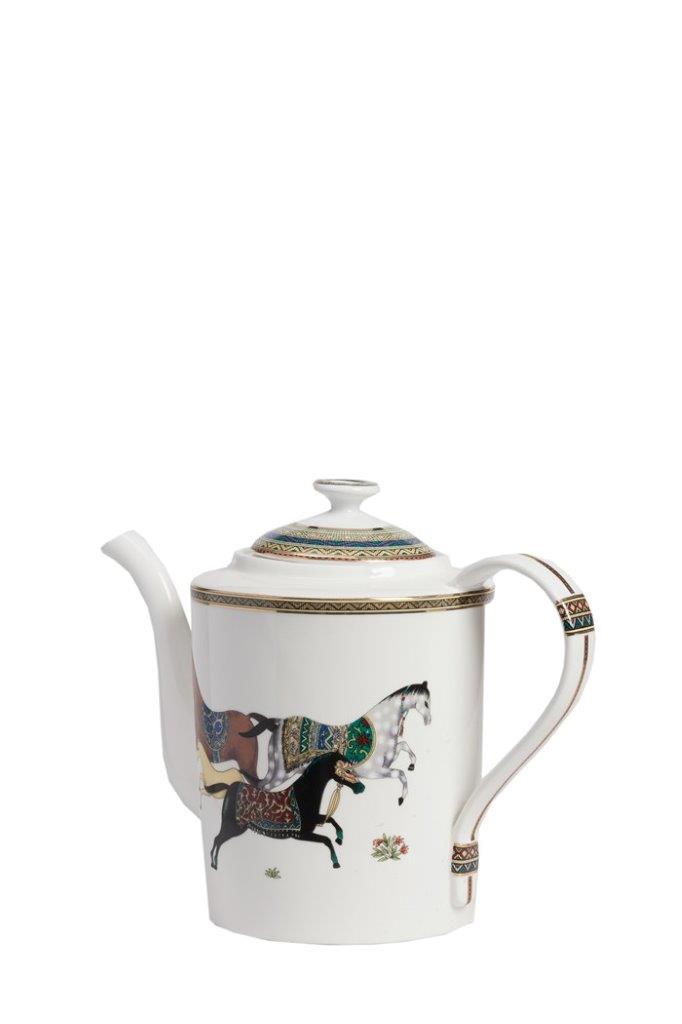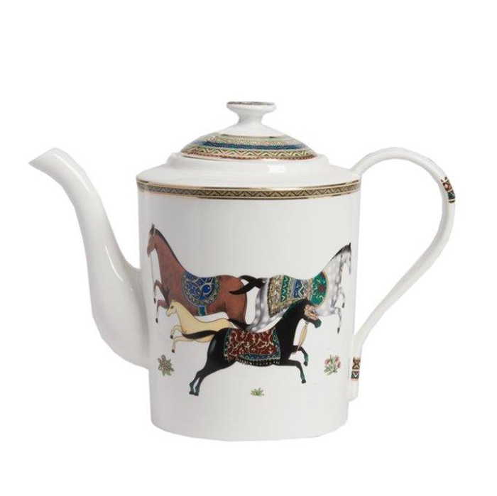 Заварной чайник Empire выполнен из керамики в стиле ампир. Декором служит яркое изображение скачущих лошадей. В верхней части и на ручке нанесен геометрический орнамент. Отличительным признаком дизайна коллекции Empire являются уникальные стилизованные образы скакунов и конской сбруи, украшающих эту великолепную фарфоровую посуду. Прекрасный подарок любителю лошадей и конного спорта. Чайник можно приобрести отдельно, а также совместно с другими предметами коллекции.